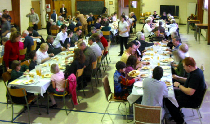 Darryl's in courses at the United Theological College. During the lunch Tom Pavlasek related how the luncheons got started at Summerlea. It seems that Tom Miles, Summerlea minister at the time, took Tom aside one day and suggested that he get some of the men together to put on a pancake lunch for pancake Sunday. This being prior to the days when men felt confident in the kitchen, Tom went home to seek help and advice from Lois. After some consternation and practice with a number of the men of the congregaton the luncheon took place with great success. And now 34 years later it continues to be a source of comradeship for the congregation, with close to 100 folks enjoying the pancakes, ham and beverages. In recent years the event has been coordinated by Rolf Smart, although Tom Pavlasek still flips a mean flapjack. Our thanks to Rolf and the other men who helped in the kitchen and to the youth of the congregation who waited table very competently. Following are a few photos. They can be picked to view a larger version. |