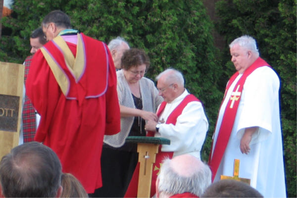The St. James minister, Rev. Arlen Bonnar, made some congratulatory parting remarks, and Jeff reciprocated by presenting him a candle to be remembered by, which Rev. Bonnar then lit. |
