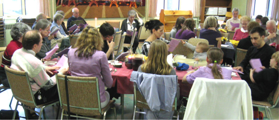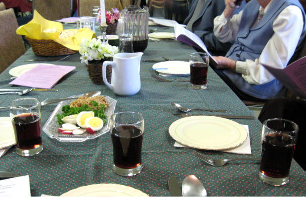 telling of the meaning of the seder symbols: Zeroah: the shank bone of a lamb, reminder of the lamb offered on Passover and that God struck the Egyptians but passed over the houses of the Hebrew people in Egypt. Behtza: roasted egg offered at the Temple of Jerusalem at the Passover festival. Maror: a piece of bitter herbs (or radish), reminder of the bitterness and hardship of slavery. Haroset: a mixture of chopped apple, cinnamon, nuts and wine, reminder of the mortar used by the forced Hebrew labourers in Egypt. Karpas: a piece of celery or parsley, is a reminder of springtime, the season of Passover. It is used as a sign of gratitude to God for the goodness of the earth, for our bread and food. Salt Water: symbolic of the tears which Israel endured in its experience of slavery, used as a dip for the karpas. Matzo: unleavened bread, symbol of the bread made by the Israelites while fleeing Egypt, when they did not have time to wait for yeast to rise. The ceremony continues with washing of hands and eating the symbols with of four cups of wine or juice, accompanied by stories of how the symbols remind us of the past. At this point the pot luck supper is consumed, followed by the eating of the Afikoman, reminder that what has been lost can be found. After the seder ceremony, the assemblage proceeds to the sanctuary to strip it of all ornamentation, to be replaced Easter Sunday morning. All in all, a moving reminder of the ancient history from which Christianity was born. |