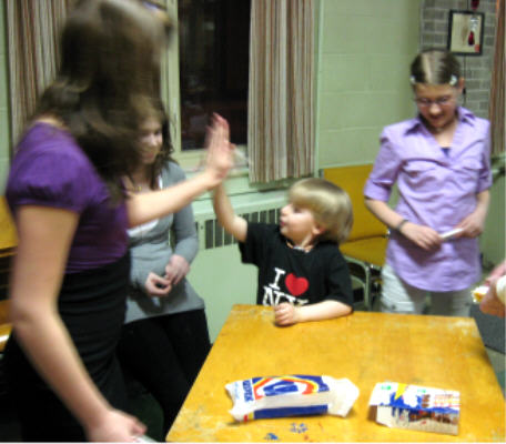 The children look for the afikomen and receive a reward. Howard had rewards for all, and Phillip Freud high fives Cassandra McKenzie. |