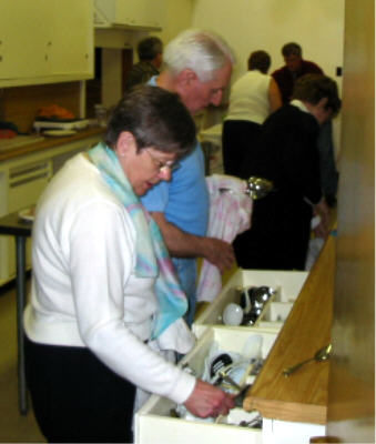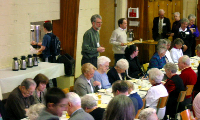 collaboration pour créer un service émouvant et agréable. À la suite du service plus de 100 personnes des deux assemblées ont pris le plaisir de savourer un repas de crêpes avec du jambon au hall Acadia. De grands remerciements à Rolf Smart et à tous ceux et celles qui ont participé en préparant le hall, cuisinant les crêpes, servant à tables, nettoyage, etc., etc., etc. Voici quelques photos des participants. |
