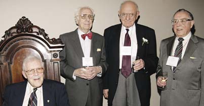 ont levé plus de 2 millions de dollars pour McGill à travers les années. À la photo on voit les organisateurs de la classe Rex Ford, BEng'44, Reuben Brasloff, BEng'44, Tom Pavlasek, BEng'44, MEng'48, PhD'58, et Joe Josephson, BEng'44. McGill News, Summer 2005 |
