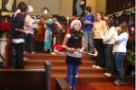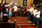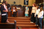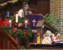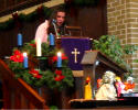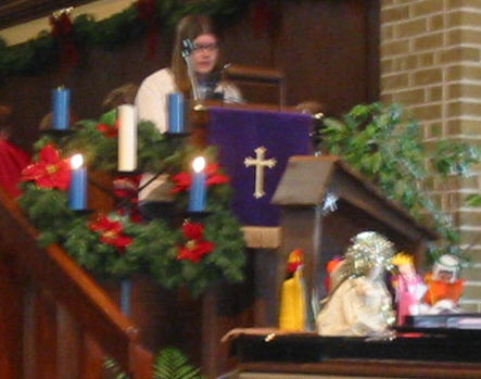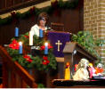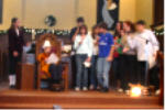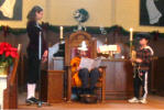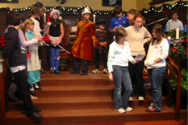 de bienfaisance. Nous remercions grandement les élèves de l'école du dimanche qui ont si fort travaillé pour se préparer pour la pièce et aux leaders Susan McKenzie et Roy Rodd. Ci-dessous se trouvent quelques photos non très claires des événements. (Nous aurions besoin d'un photographe qui saurait faire de bonnes photos en éclairage limitée sans flash - bénévols bienvenues.) On peut cliquer les photos voir une version plus grande. |