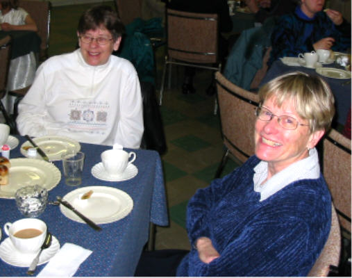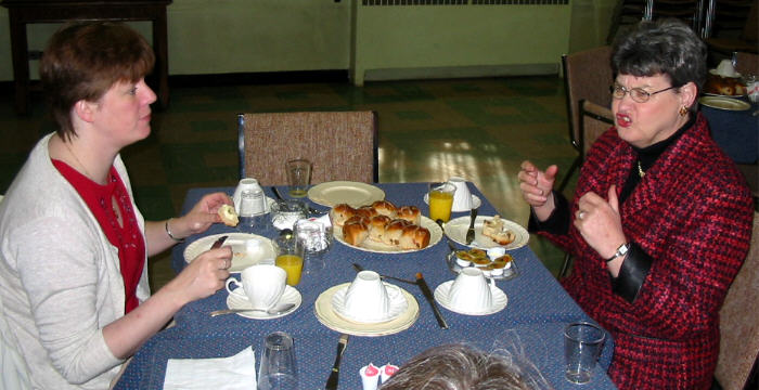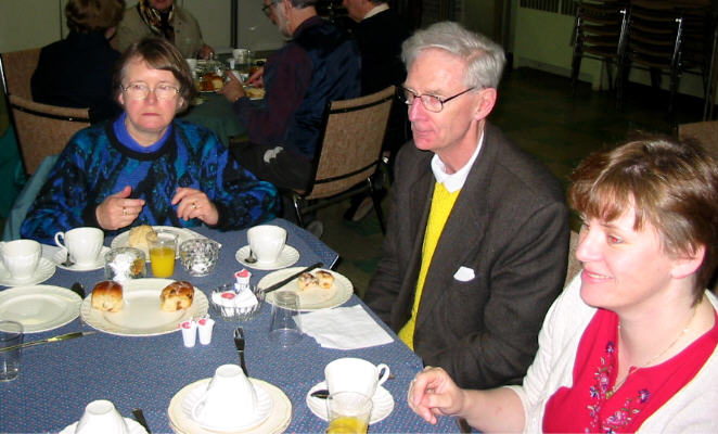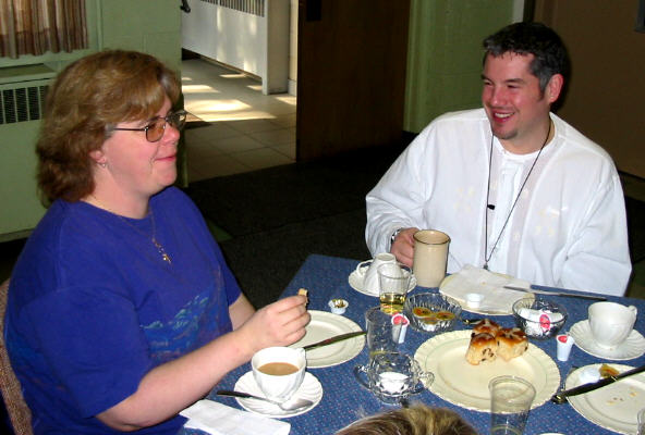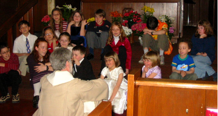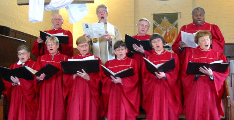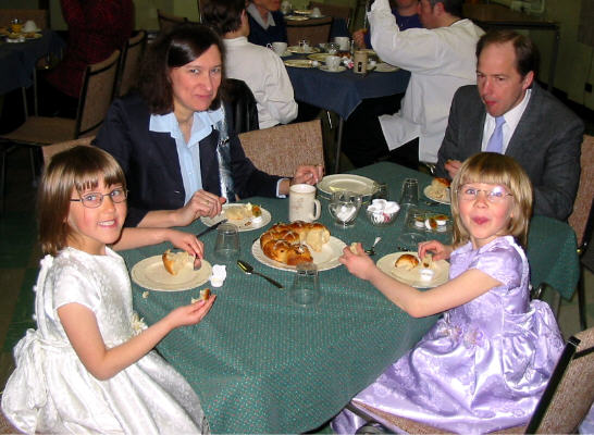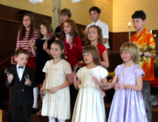 était déjà levé depuis quelques heures à 7h30 quand on s'est réuni à l'église avant le service). Après le service au lever du soleil les participants sont revenus à l'église pour remettre en place les ornaments qu'on avaient enlevés le jeudi saint après le souper Seder, et puis pour partager un petit déjeuner de jus, brioches de carême et café. Au service de Pâques à 10h la maison fut complète. Les churs senior et junior ont offert de la musique joyeuse et le Rév. Howard a racconté des histoires pour faire comprendre et aux jeunes et aux autres la vraie signification de Pâques. Vous trouverez ci-dessous quelques photos des participants. Il y a plusieurs grandes photos donc il se peut qu'il y ait un délai d'ouverture. |