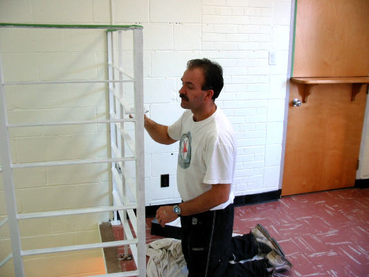l'étage, après avoir installé un nouveau drain du toit et une chaufferette à la salle de bain. En parlant dernièrement avec des gens d'une autre église Unie de l'île de l'ouest quand ils nous faisaient visite, ils nous ont remarqué de l'air de bon entretien à Summerlea. Merci à Kevin et aux membres du comité de propriété et d'entretien de la si bien entretenir. On a fait un couple de photos de l'entrée M&O avec Kevin au travail. |