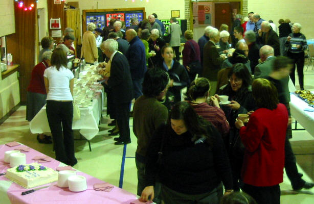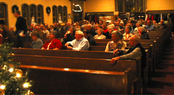 Summerlea en soirée le dimanche 28 novembre 2004. Le service a témoigné 186 années de ministère de St. Andrew's à Lachine et à Chateauguay, débutant en 1818 avec l'ouverture de l'église Presbytérienne écossaise de Lachine et de Chateauguay. Leslie et Keith Field ont ouvert le service en jouant à saxophone la pièce Pavane de Ravel. Ont fait des lectures le rév Ian Fraser (pasteur étudiant 1981-1982), rév. Glynis Williams (modératrice temporaire 1993-1997) et le rév Howard Clark de Summerlea. La rév Sheina B Smith, pasteur de St. Andrew's 1982-1993, a assisté au service de communion. Une vignette prière de Keith Field suivi de quelques vignettes du rév Darryl Macdonald, ont tracé l'histoire de St. Andrew's de la date de fondation en 1818, par le schism de l'Union en 1925 et la reconstruction par après, agrandissement après la deuxième guerre mondiale suivie de déclin, et le traumatisme récent du départ de l'autorité centrale Presbytérienne en support de Darryl. Ces vignettes ont en même temps souligné la reconstruction qui a suivi chaque défit, tel qu'arrive actuellement dans la union avec Summerlea. Avant de faire la lecture le rév Clark a mentionné qu'on avait découvert dernièrement au bureau de Summerlea le livre de procès-verbaux (Minute Book) qui avait été présentée à la session de l'église Presbytérienne Summerlea en 1914, ce qui nous rappelle les racines presbytériennes de Summerlea. |